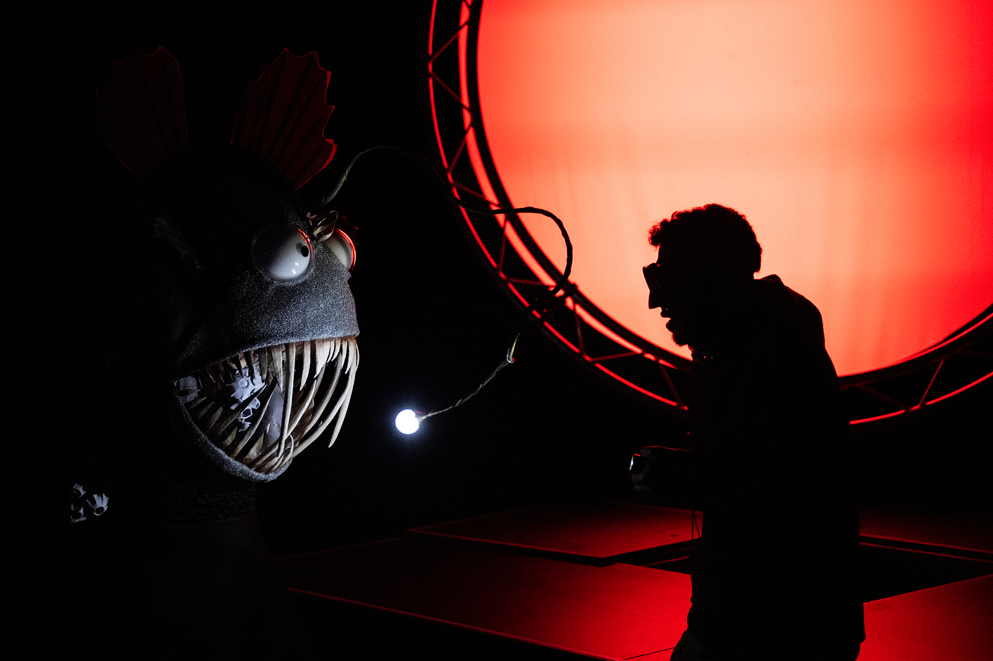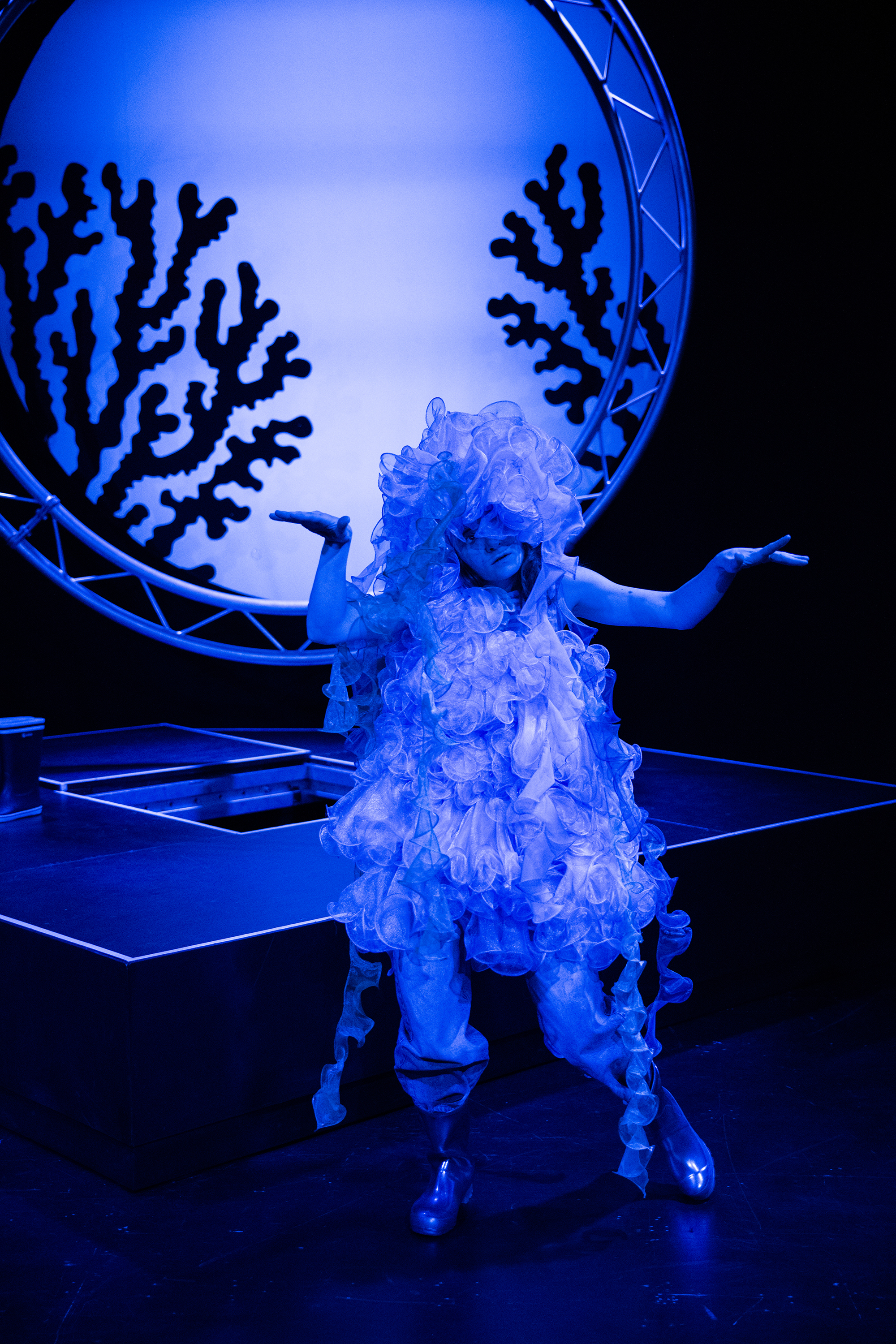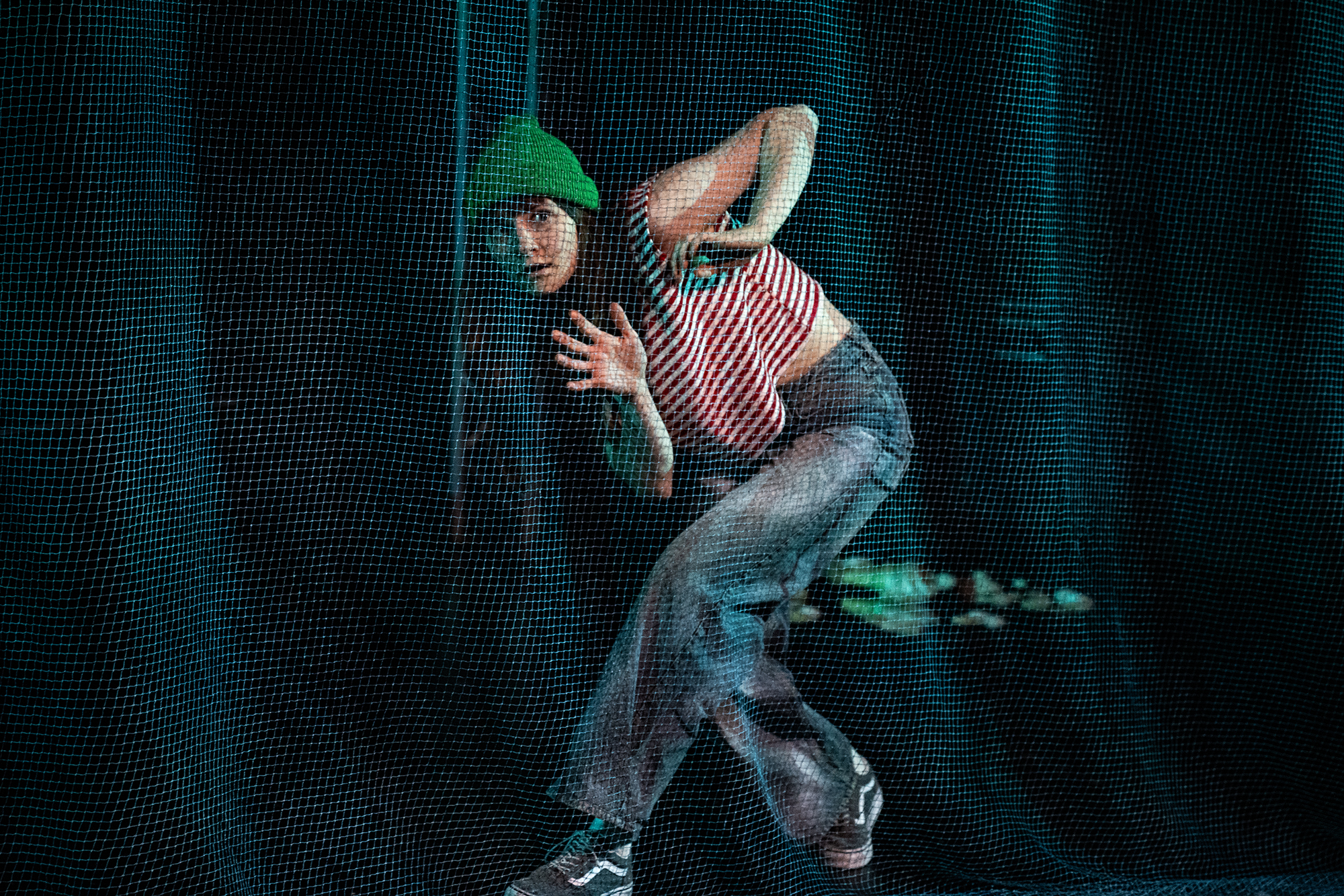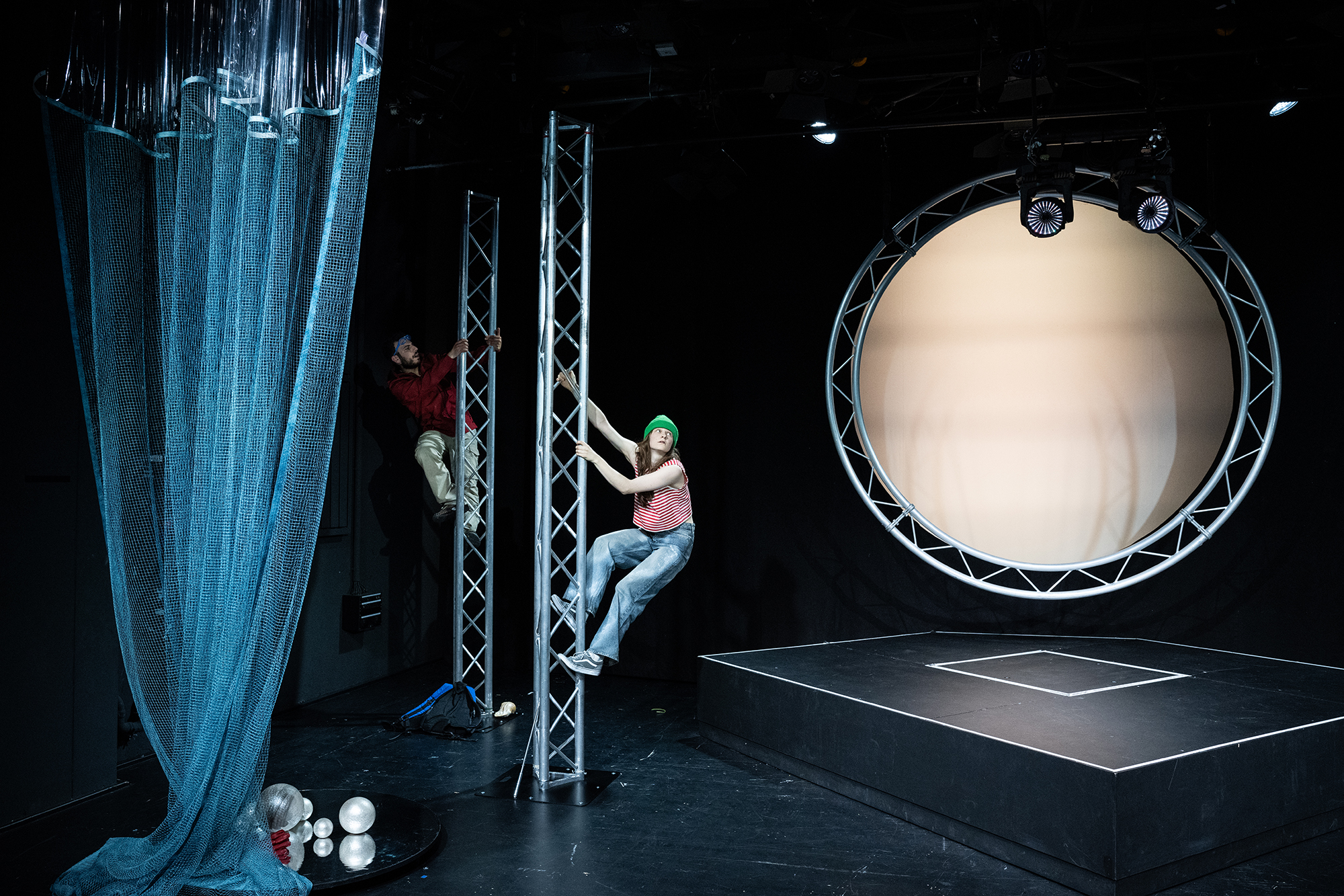 grobmaschiges Netz, Sperrholz, Schaumstoff, Traversen, Theaterzargen, Spiegeltanzteppich, Operafolie, Hazemaschine, diverse Requisiten